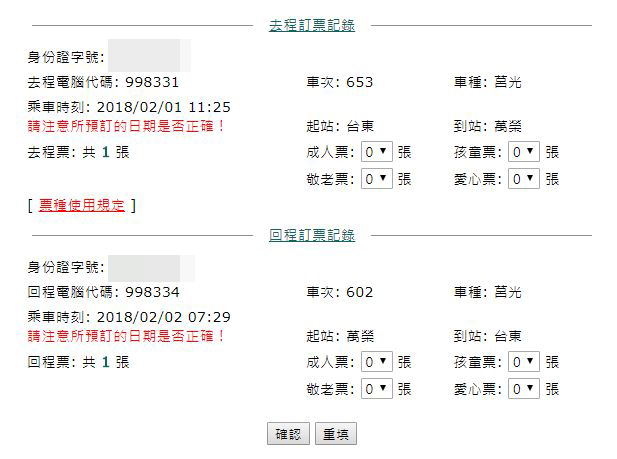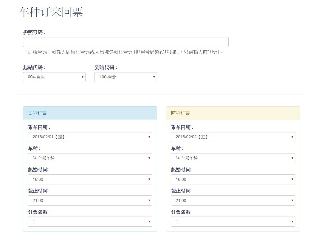 要是沒有預先查詢,那麼它會自動幫你選好在期間內,容許訂票的車次。上面的內容,必須全部填好。包括去站和到站、日期、時間、訂票張數。電腦會自動找出附合條件的車次。