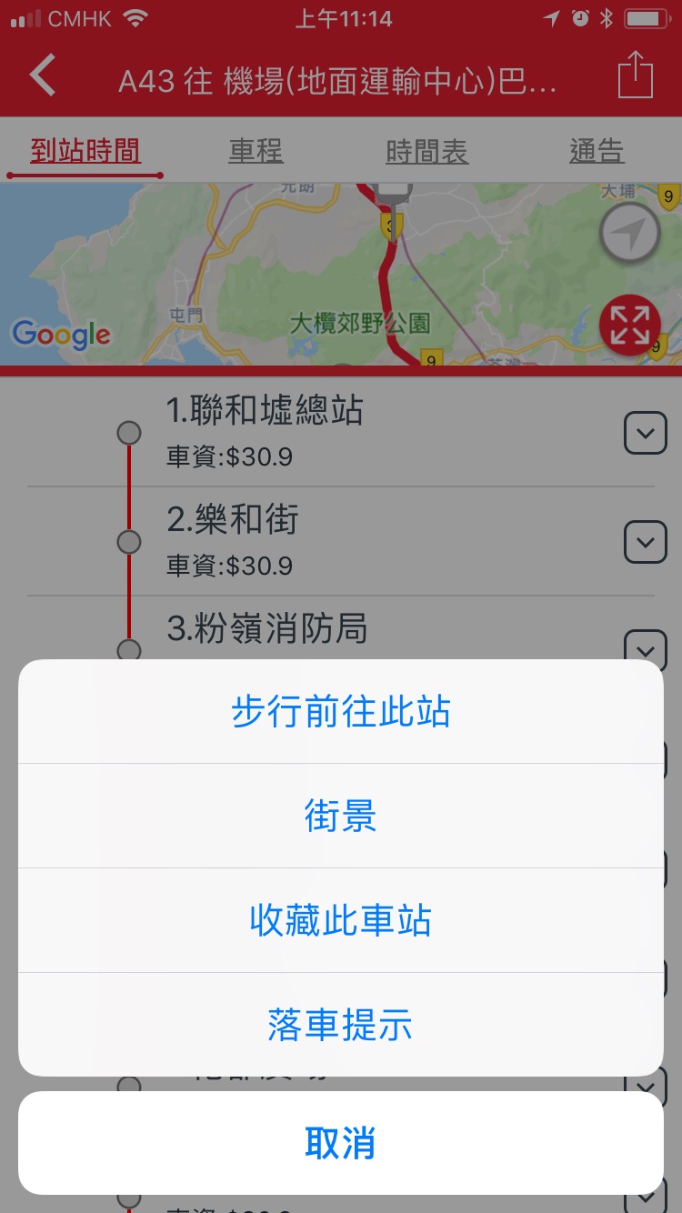 版面上可以看到該巴士線的全部站點、最近你的是哪一個,怎麼走過去比較快。
