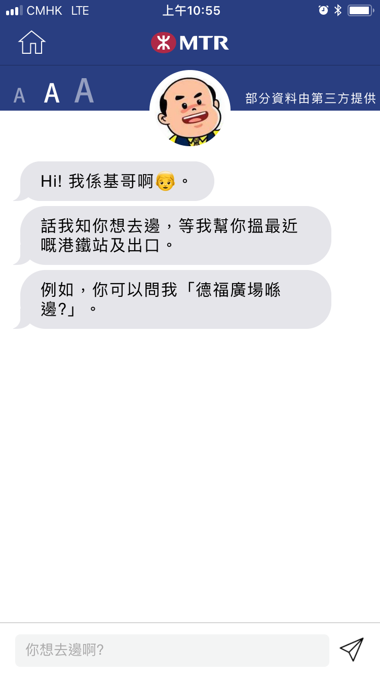 MTR APP好用之處是隨時可以看到MRT地圖(雖然所有鐵路站都有),可以了解轉車的情況。還可以用語音問基哥,某個目的地怎麼走……